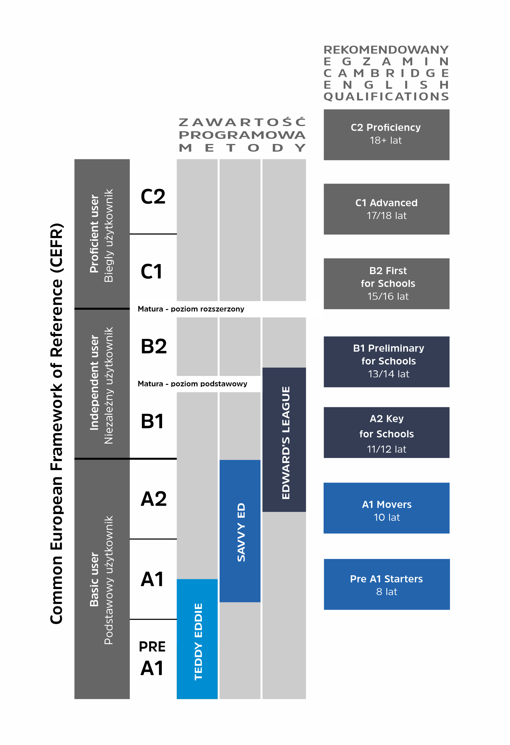 Ścieżka edukacyjna Edu Bears jest jednocześnie ścieżką egzaminacyjną. Już po kursie Savvy Ed dziecko jest przygotowane do międzynarodowego egzaminu Movers, na poziomie A1+. W wieku 14 lat i po kursie Edward’s League uczniowie podchodzą do egzaminu B1 Preliminary for Schools.
